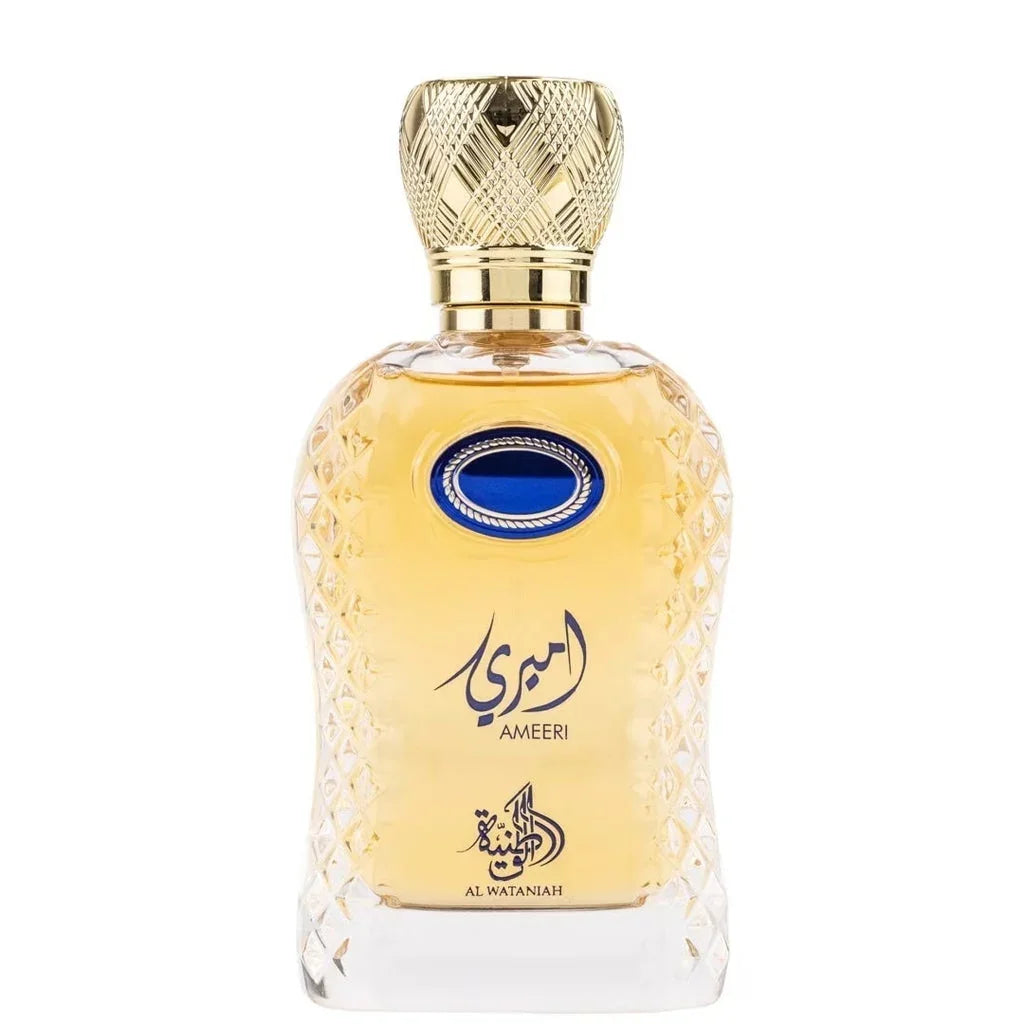 A embalagem de Al Wataniah Ameeri EDP 100ml é tão impressionante quanto a própria fragrância. O frasco é uma obra de arte em si, com seu design elegante e moderno que reflete a qualidade e a exclusividade do perfume. A tampa dourada e os detalhes ornamentados adicionam um toque de luxo e sofisticação, tornando este frasco uma peça de destaque em qualquer coleção de perfumes.